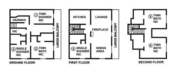 Main entrance. 2 twin rooms, one with shower, basin and WC, one with bath, shower, basin and WC, 1 single room with shower, basin and WC. Ski and boot storage. Hammam.