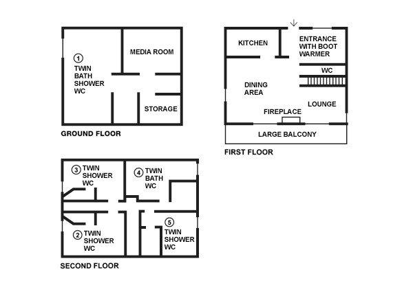 FIrst Floor Main entrance with boot warmer. Large lounge and dining area. Ethanol fireplace. Kitchen. Large balcony. Separate WC. Separate ski storage.