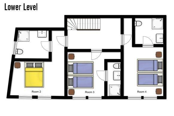 Room 1 = twin or king-sized double with shower and WC- suitable for a cot.