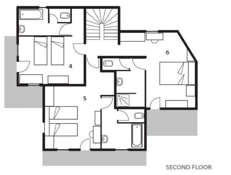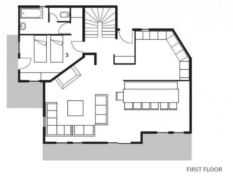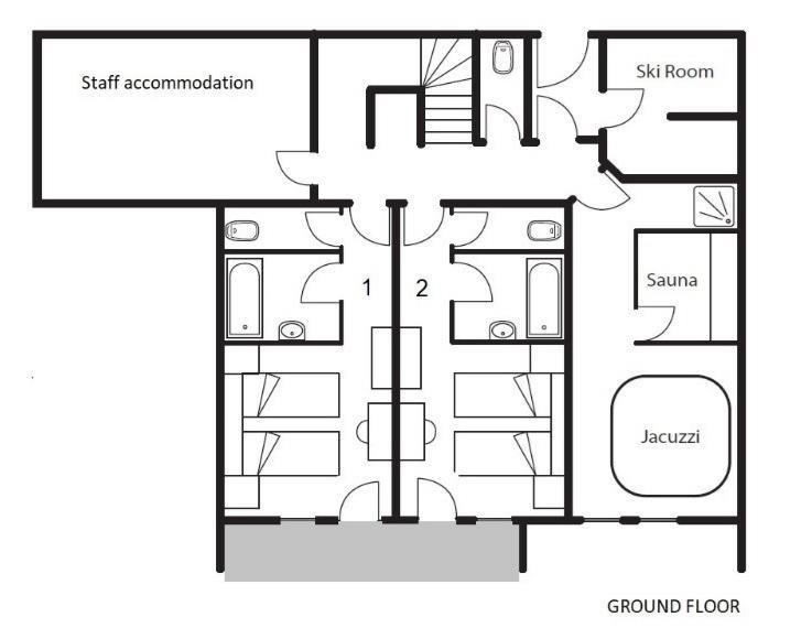 You can enter the chalet at ski entrance level to find hot-tub, sauna, boot room and two en-suite twin rooms with access onto their own terrace space.