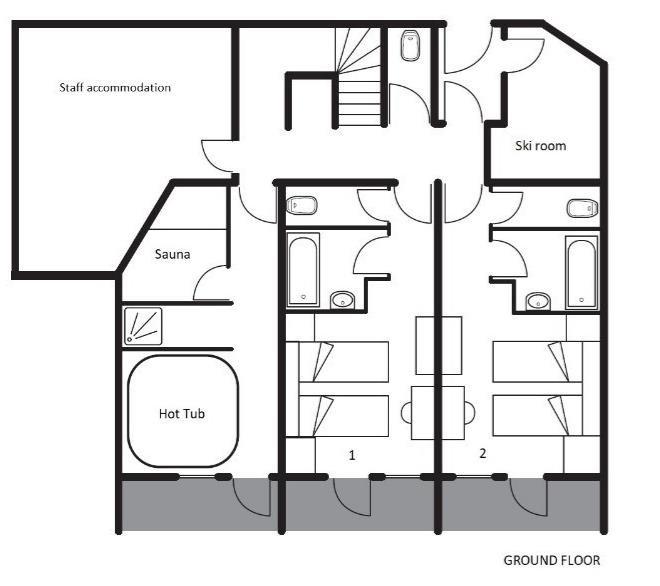 At ground floor level you will find the ski entrance that leads to indoor hot-tub, sauna, boot room and two twin bedrooms complete with en-suite facilities and access to their own terrace areas.