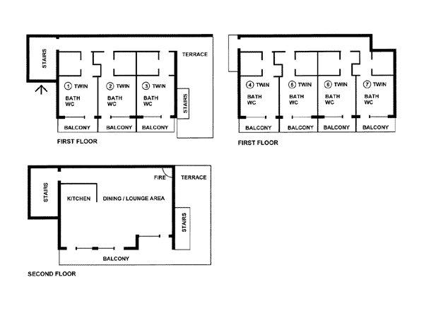 7 twin rooms all with bath, shower, basin, wc and balcony (4 in eaves)
