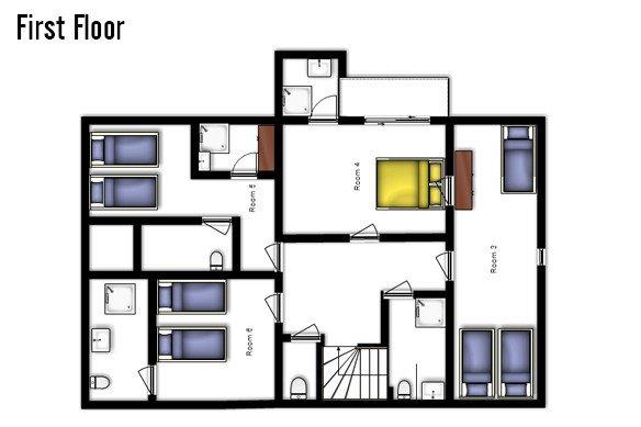 Room 4 = double with shower and balcony. Private WC (not en suite)