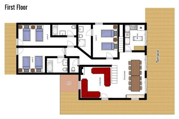 The open-plan lounge/dining area has sofas, a fireplace, windows leading onto a terrace with for access the outdoor hot tub. The kitchen is well equipped with: two full-size ovens, six burner induction hob, full-size fridge freezer, large dishwasher, microwave, tea&coffee station. The atmosphere is modern and cosy, the chalet is decorated with stone, timber and contemporary furnitures. All the rooms are en-suite and some have jacuzzi bath and terraces. The chalet is built on Meribel's hillsides and offers beautiful views on the valley. You can also use the gym equipment, the private sauna and hot tub or just have a drink on the beautiful terrace. For a relaxing evening you can sit in the TV room and watch a family movie! There is a also a ski room with heated boot warmers and Wi-FI is included in the entire chalet.