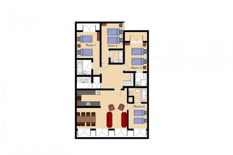 The chalet is on the fourth floor of the building and can be accessed directly from the lift or stairs. The open plan kitchen-diner benefits from a lovely wooden table that can accommodate 8 guests. The living area has comfortable sofas, TV and direct access to a full-length balcony. The kitchen is equipped with: a full-size oven, four burner halogen hob, full-size fridge with small freezer drawer, large dishwasher, microwave, tea & coffee station.
