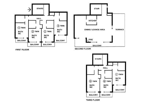 - 3 twin rooms all with bath/shower, basin, w.c. and balcony (2 in eaves)